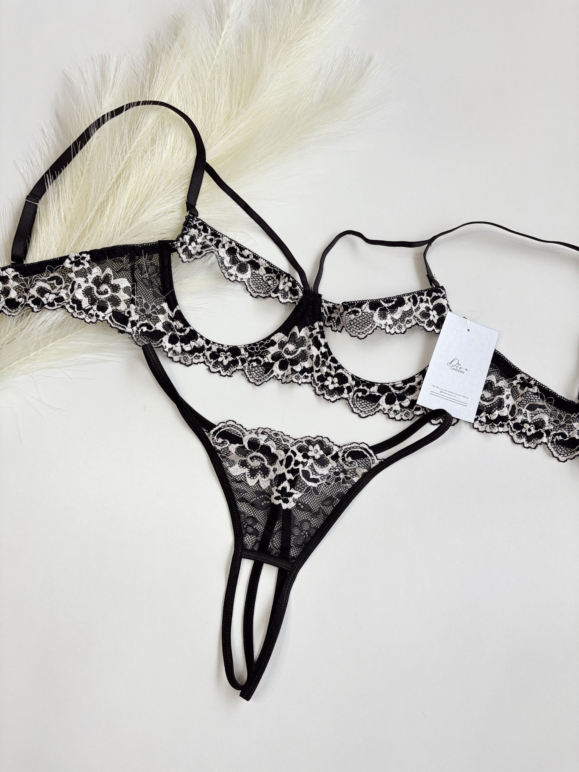 La lencería Gala de dos piezas ofrece un diseño elegante con delicados bordados de encaje y partes abiertas. Realzado con un ajuste cómodo y seductor, este conjunto te hará sentir irresistible y segura de ti misma. Perfecto para una noche especial o para sorprender a tu pareja.