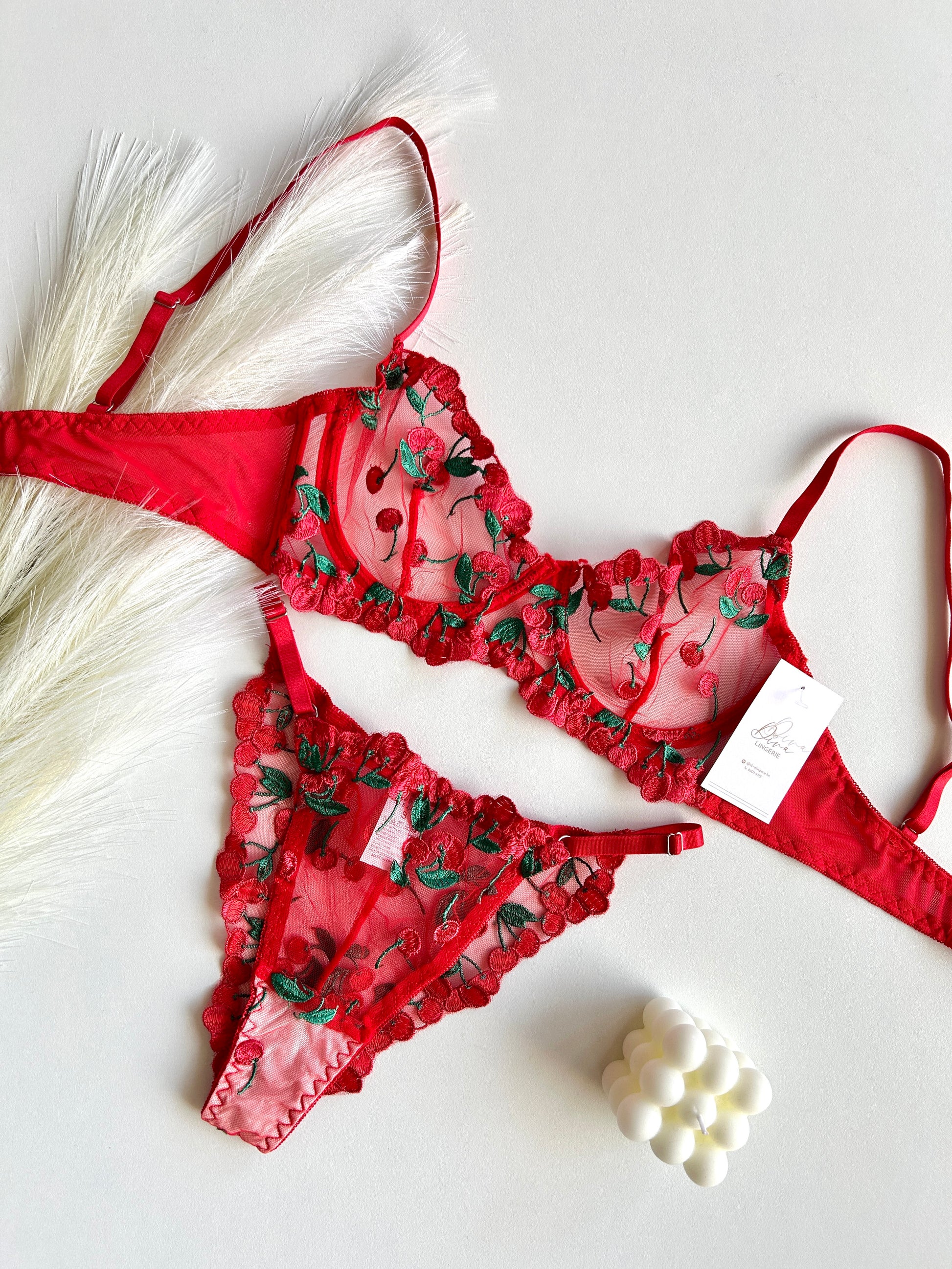 Este conjunto de lencería Rojo Carmesí es elegante y sensual. Consta de dos piezas, con un bordado de cerezas que le da un toque coqueto y femenino. Disponible en tallas S a XL. Perfecto para sentirte atractiva y cómoda al mismo tiempo.