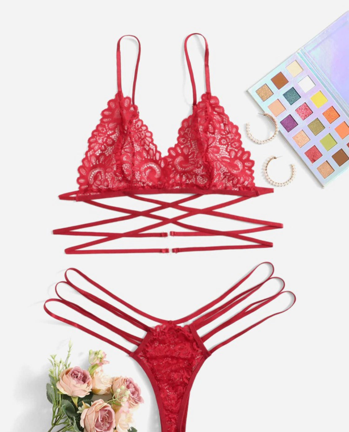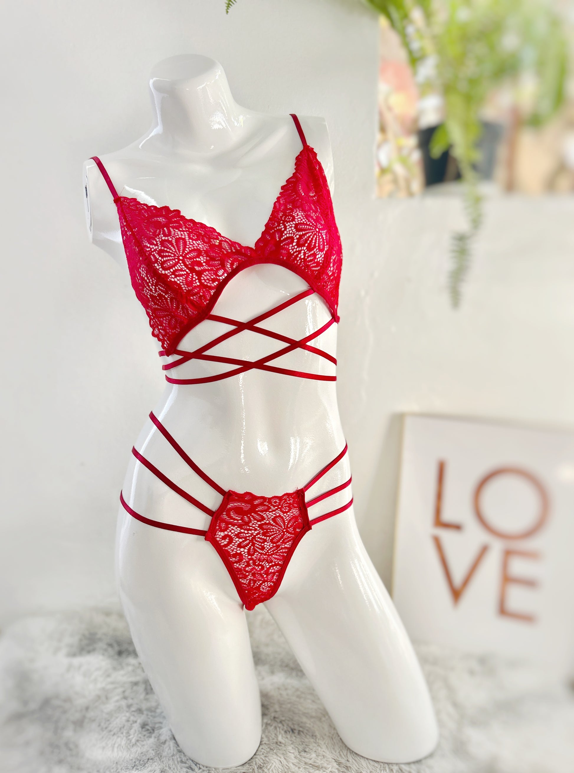 Set de encaje color rojo con detalles de tres líneas en su panty y parte cruzada de la espalda