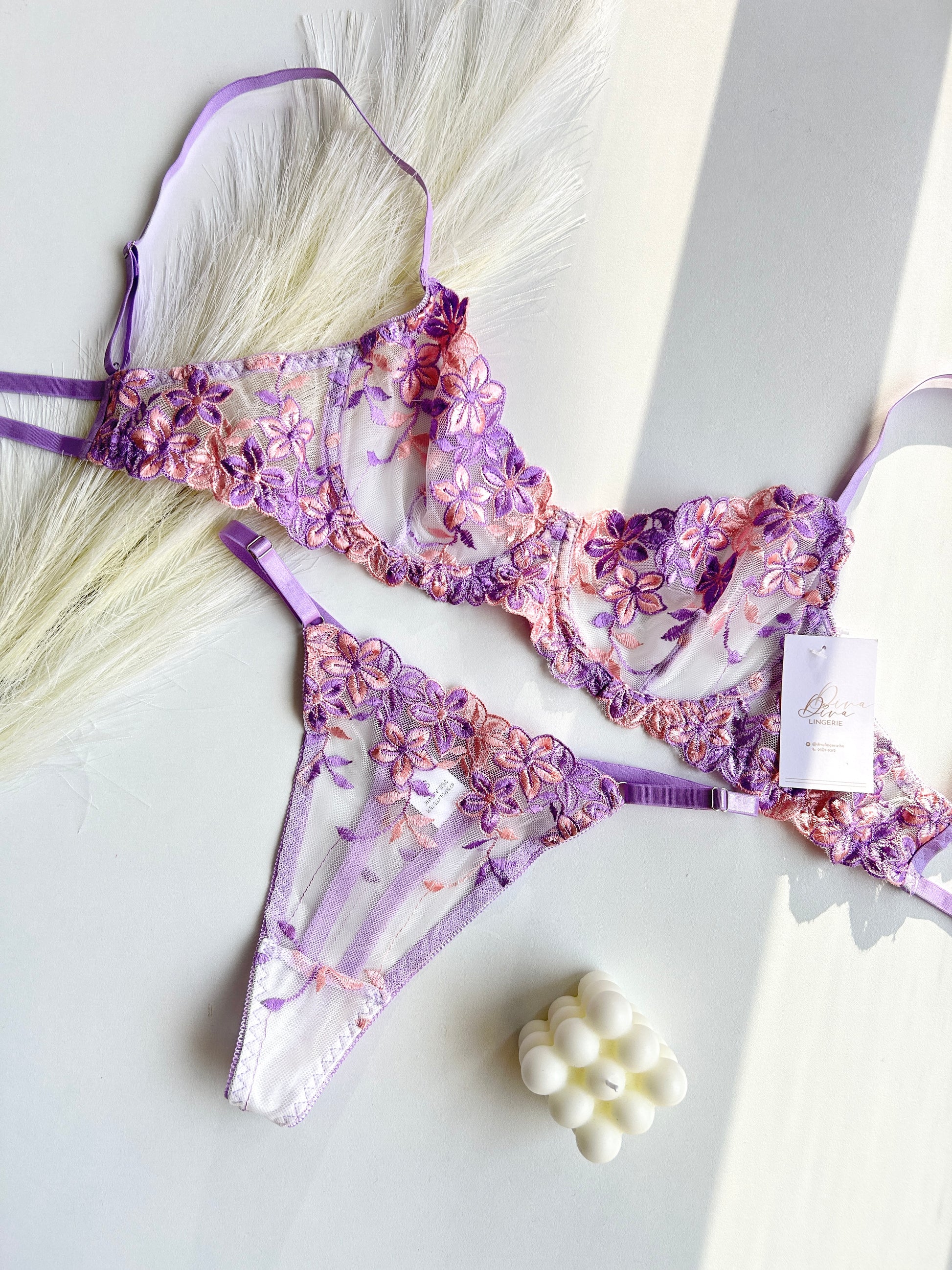 La lencería Violeta es ideal para resaltar tu feminidad con estilo. Con su delicado bordado floral en morado y detalles en rosa suave, te hará sentir elegante y sensual. ¡Disfruta de la comodidad y belleza de estas dos piezas!